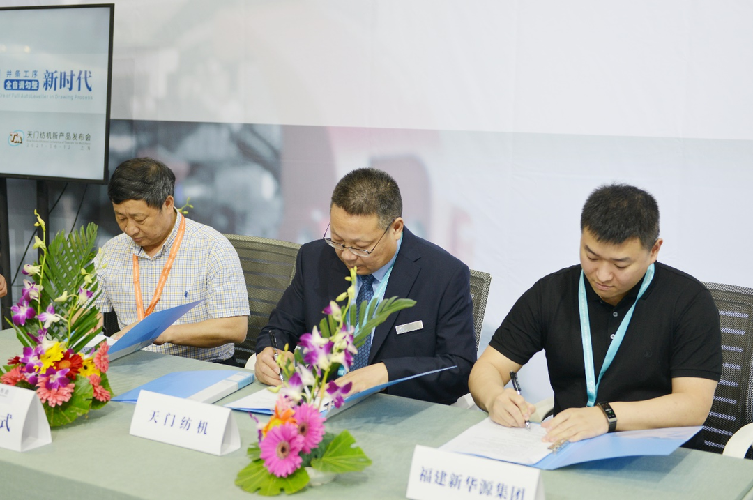 發(fā)布會(huì)上,TM15、TM19首批客戶福建新華源紡織集團(tuán)有限公司、湖北妙虎紡織有限責(zé)任公司等紡企,與天門紡機(jī)現(xiàn)場簽訂戰(zhàn)略合作協(xié)議,將在“并條工序全自調(diào)勻整”深度合作、攜手共進(jìn)。