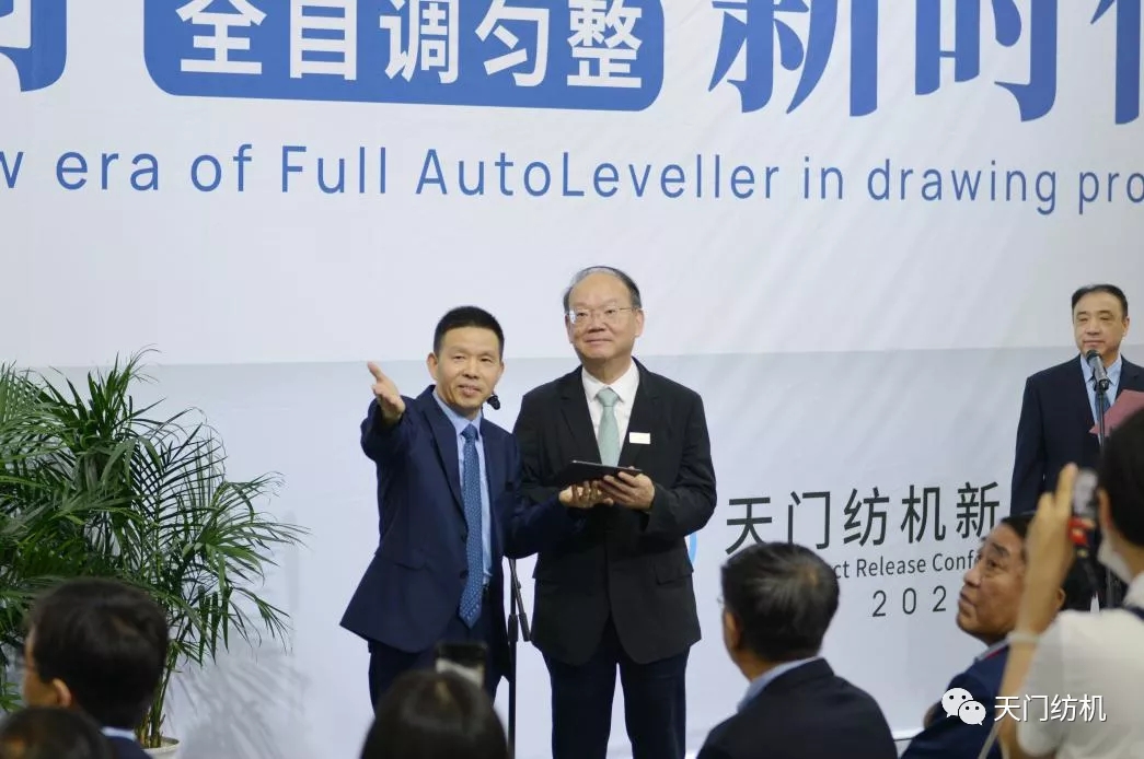 2021年6月12日,在上海國際紡機展上天門紡機舉行“開創(chuàng)并條工序全自調(diào)勻整新時代”新品發(fā)布會,中紡聯(lián)黨委書記高勇使用手持終端為新產(chǎn)品開機