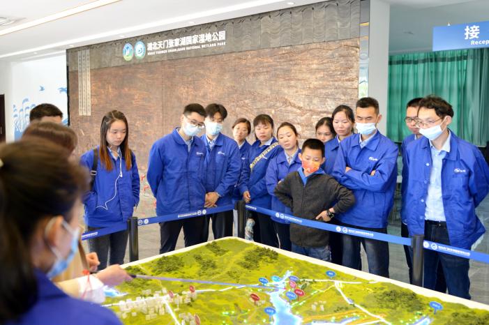 公司全體青年員工坐乘大巴車來到了張家湖國家濕地公園,它位于湖北省天門市九真鎮(zhèn),湖泊水域面積6.53平方公里,平均水深1.8米,是典型的淺水湖泊,其濕地類型屬內(nèi)陸淡水湖泊,是天門市最大的湖泊,也是湖北省保持原始生態(tài)最好的湖泊之一。到上世紀(jì)二十年代,隨著湖區(qū)淤積、湖泊萎縮,西部形成張家湖,東部形成石家湖。到達(dá)目的地后,公園的工作人員進(jìn)行了熱情地接待,大家仿佛穿越到了原生態(tài)的農(nóng)耕時代,湖泊密布,半島羅列,河湖相通,一派水鄉(xiāng)澤國、湖光田園景象。來到觀鳥臺,登高望遠(yuǎn),一覽張家湖美景和各種野生鳥類。公園設(shè)有科普館,里面陳列了濕地的人文風(fēng)貌及天門的特色文化,還有各種攝影大片。